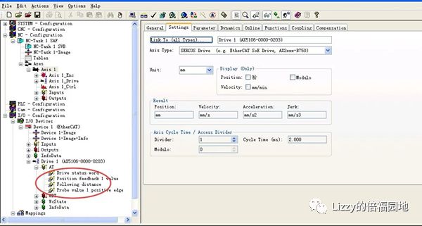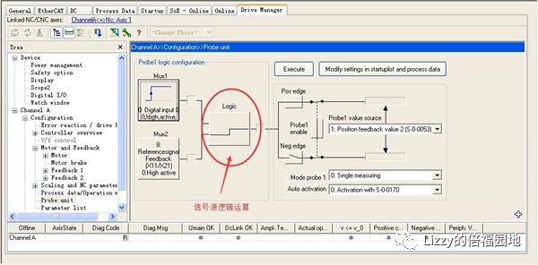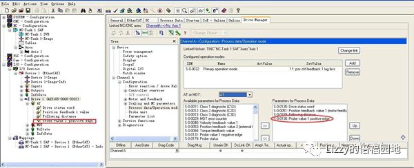 如此配置的话,先要在硬件中配置Latch功能:对于驱动器需要配置IO,添加startup参数和ProcessData,然后会出来Probe value值;对于EL51xx模块,自动就有Latch value。NC链接完成后,这个Latch位置值会送到NC的到nInData2中(nInData1是编码器的实时位置);