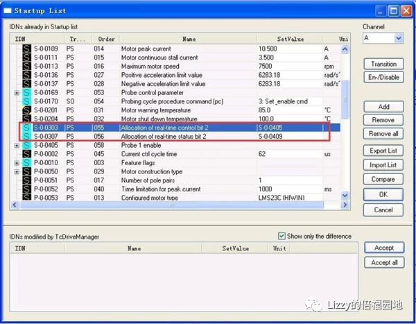 7)检查Startup List中的参数是否更新,另外检查S-0303和S-0307是否已经变更为405和409;改变为上述值说明之前修改正确;以上各个参数都给出了相关的参数号,因此直接在startup list中手动一次性添加完也是可以的。