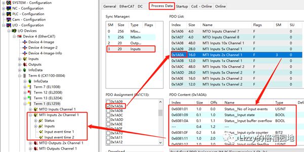 在EL1259的Process Data页面,Sync Manager中,双击3(Inputs),并在下方的PDO Assignment(0x1C13)中勾选需要的PDO。每个PDO的内容在右侧的PDO List中可以看到。如图所示: