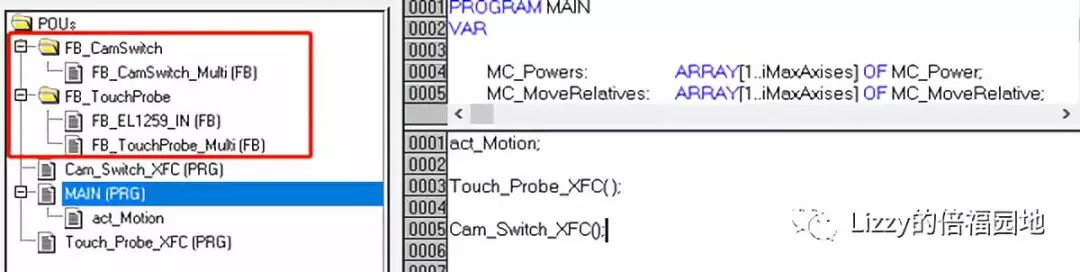 新的XFC硬件模块需要配合新的库文件,使用里面新FB和结构体才能方便地控制新XFC模块的过程数据。为此作者封装了两个以IO通道为接口的FB,帮助用户快速使用多时间戳的XFC_TouchProbe和XFC_CamSwitch功能。