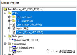 从PLC Control的主菜单Project下选择“Merge”,然后选择以下对象: