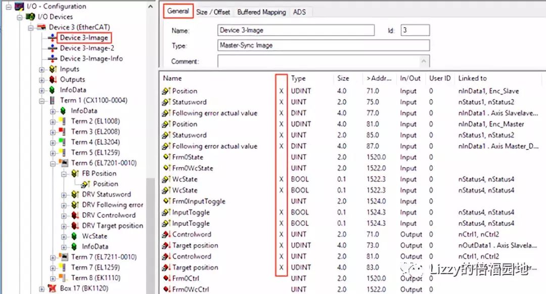 任务刷新IO的时候,重要的是这两个内存地址的对应,这就是变量映射。类似的变量映射还有很多,所有的映射都可以从EtherCAT的Image中观察: