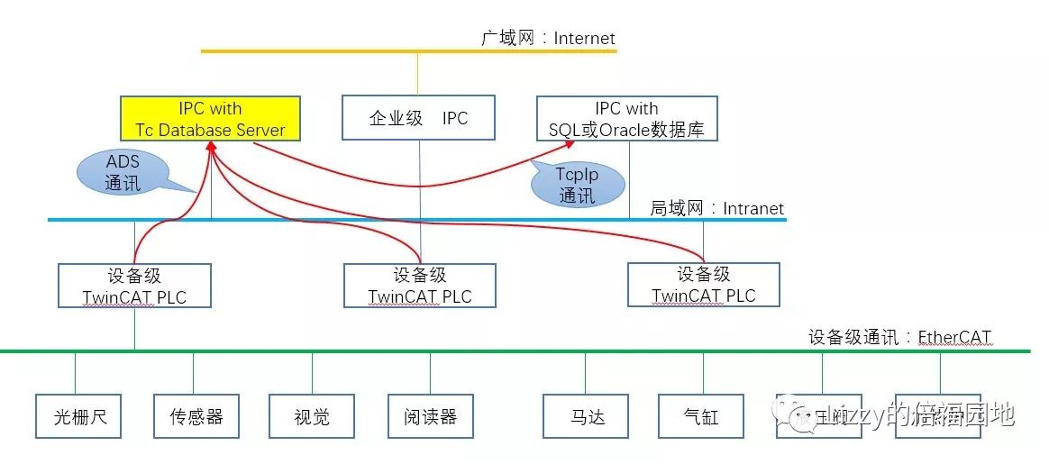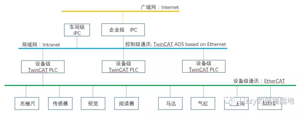 自动化设备的单机性能不断提升之后,企业对质量追踪、生产数据统计和分析提出了新的要求,需要设备的控制系统与企业局域网通讯。由于倍福PLC本身就是一台“计算机”——Window操作系统和自带1个或者两个以太网口——可以直接接入工厂局域网。PLC在局域网中的位置如图所示: