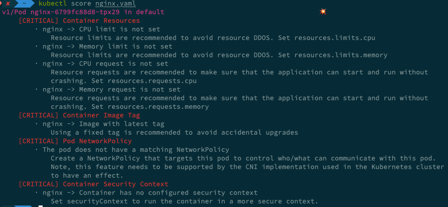 比如,还是上述的 Nginx Pod,运行 kubectl score nginx.yaml