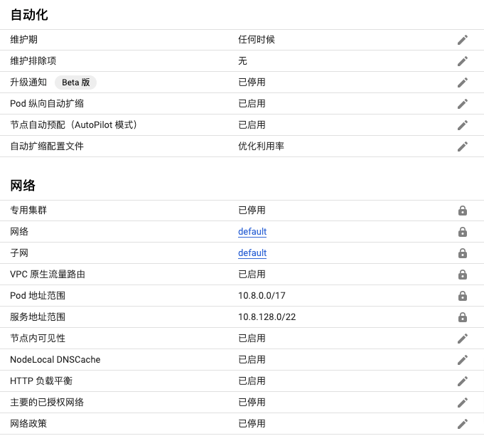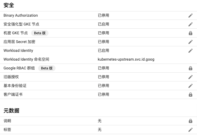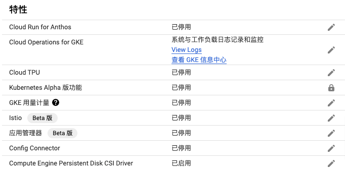 GKE 集群创建后,可以在其详细信息页面看到其他停用的特性: