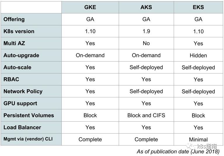 在 AKS 发布 GA 的第一时间,Tirumarai Selvan 对 AKS、EKS 以及 GKE 等三个主流托管 Kubernetes 服务做了简单对比,如下图所示