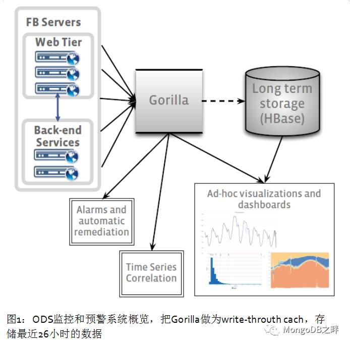 Facebook的基础设施由数以百计个分布在不同数据中心的系统组成,如果没有一个监控系统来跟踪它们的健康和性能,要操作和管理它们是非常困难的。“操作数据存储”(ODS)是Facebook监控系统的一个重要部分。ODS包括一个时间序列数据库(TSDB),一个查询服务,以及一个检测和报警系统。ODS的TSDB是在HBase存储系统之上建立的,相关描述见文末引用[26]。图1整体展示了ODS的协作方式,时间序列数据由Facebook主机上的服务产生,通过ODS的写入服务收集,最终写入到HBase中。