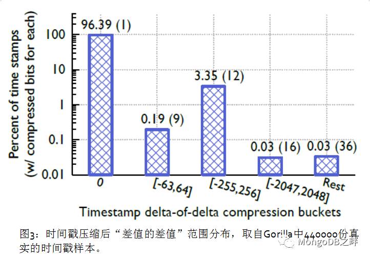 图3展示了Gorilla中时间戳最终值的分布情况,我们发现有96%的时间戳都能被压缩到1个单独的位来存储。