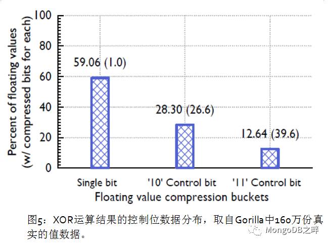 图5是Gorilla中实际的数据分布情况,大约有59%值只用了1位存储,也就是当前值和前序值完全一样;28.3%控制位为’10’(上面提到的规则a),平均占用26.6位;余下12.6%的控制位为’11’,平均占用36.9位,位数多是因为对前置0和中间非0位的长度编码需要额外13位。