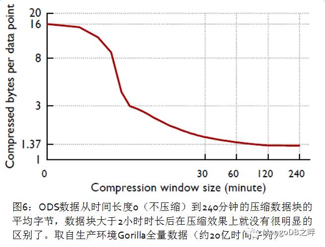我们的编码方案有一个折衷是压缩算法的时间跨度,在更长的时间跨度上使用同样的编码能够获得更好的压缩比,但是这个跨度上的短时间区间查询可能需要在数据解码上消耗额外的计算资源。图6是存储在ODS中的时间序列在不同数据块大小下的平均压缩率,可以看出块大小超过两个小时以上后,数据的压缩率收益是逐渐减少的,一个两小时时长的块可以将每个点的数据压缩到1.37字节。