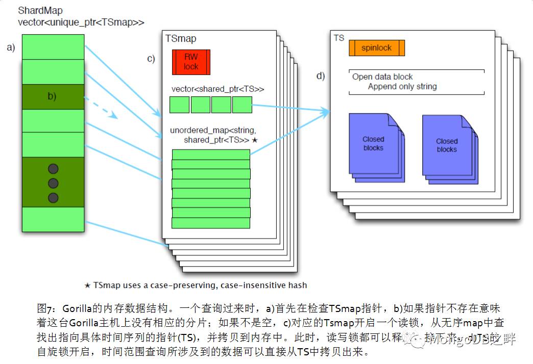 如图7所示,分片唯一标识(shardId)与TSmap之间的映射存在ShardMap中,它也是一个vector,存储了TSmaps的指针,它使用了和TSmap一样对大小写不敏感的hash算法将时间序列名称映射到各个分片,hash后的值在 [0,shard数量)区间内。由于系统中分片的数量是恒定的,并且总量在几千以内,所以存储空指针的额外开销基本上可以忽略。和TSmaps一样,ShardMap有一个自旋锁来处理并发访问。