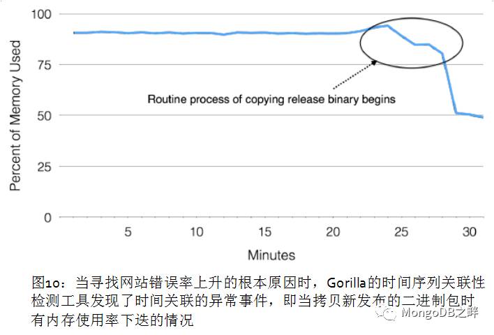 一个神秘的问题导致网站错误率出现高峰,错误率上升几分钟后在Gorilla可以观察到异常,这时由监控系统发出一个异常警报,几分钟后警报通知到相关的技术团队。然后,辛苦的问题修复工作开始了,一组工程师缓解了这个问题,其它人开始寻找问题的根源。通过使用基于Gorilla构建的工具,包括前面第5节介绍的时间序列关联搜索,他们发现将发布的二进制包拷贝到Facebook web服务器这个常规流程出了问题,导致整个网站内存使用率下跌,见图10。问题的检测,各种各样的调试和故障原因分析,依赖于在Gorilla高性能查询引擎上构建的时间序列分析工具。