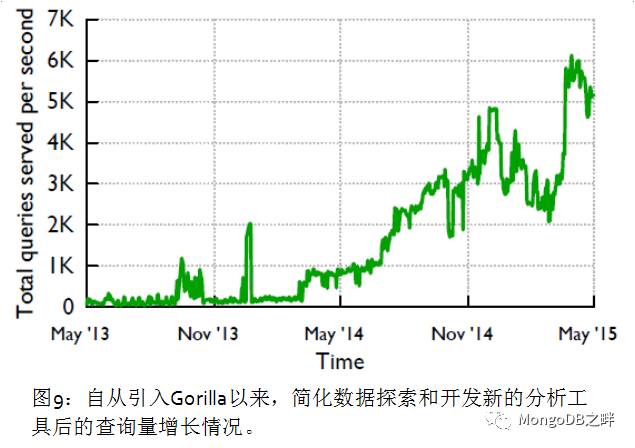 读取的延时。高效的压缩和内存级数据结构极大的加快了数据读取的速度,并且促进增加了很多使用场景。当Gorilla推出时ODS每秒支撑450次查询,很快Gorilla就超过了它,目前每秒处理超过5000次常规查询业务,峰值时达到每秒40000的查询,如图9所示。低延时的读取鼓励我们的用户在Gorilla之上构建更高级的数据分析工具,如第5节的描述。