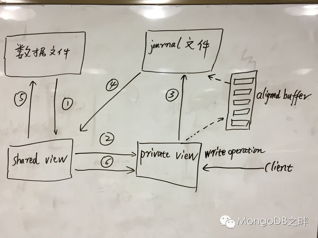 private view中的数据用来响应读操作。private view是一个接收MongoDB写操作的地方。当journal提交后,MongoDB将private view的更改复制到shared view, 这些更改最终通过shared view刷到磁盘数据文件中。