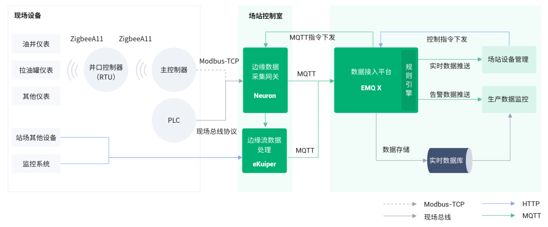 在场站端,通过工业数据采集网关 Neuron (https://www.emqx.cn/products/neuron) 将现场采用 Modbus-RTU、Modbus-TCP 协议的仪表数据转换成高可靠轻量化的 MQTT 协议,再将实时数据通过专网将 MQTT 协议推送到厂区中心机房的数据接入平台 EMQ X;