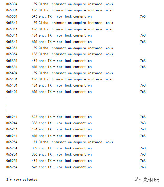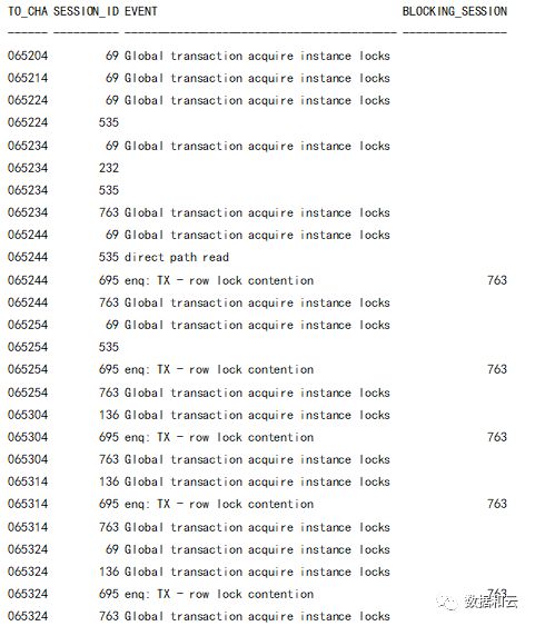 当然数据库中TOP 5中最严重的等待不一定是问题的根源,分析问题时刻的 ASH 信息,在问题时刻,最先出现的是全局事务获取锁的等待,随后开始出现行锁等待:
