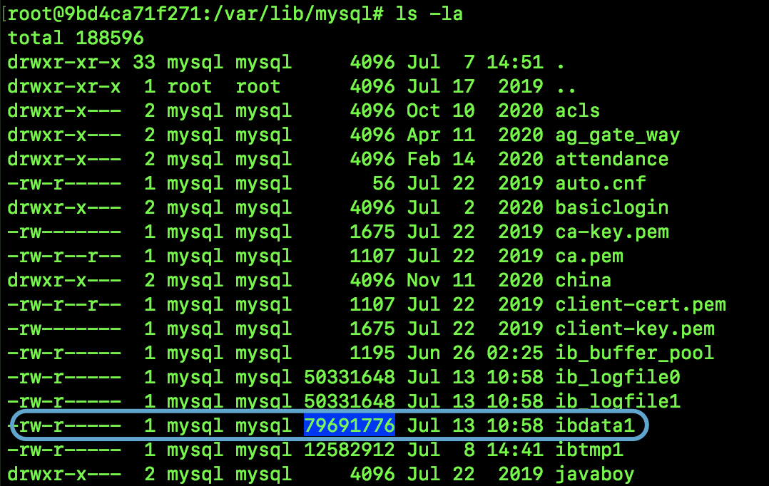 那么共享表空间的 ibdata1 文件又在哪里呢?其实就在 MySQL 存放数据库的目录下: