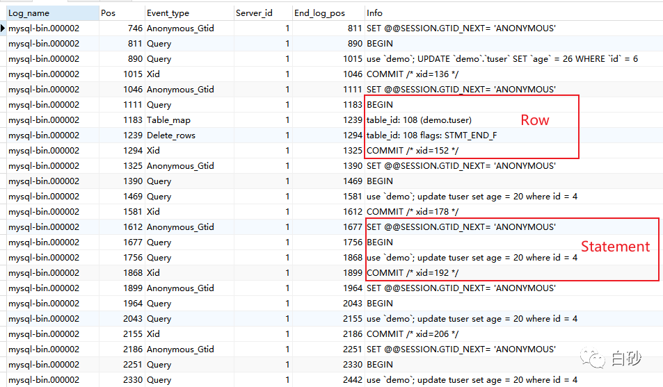 可以看到 Statement 格式记录的是完整的语句原文,而 Row 格式记录的是操作什么表和什么行为。