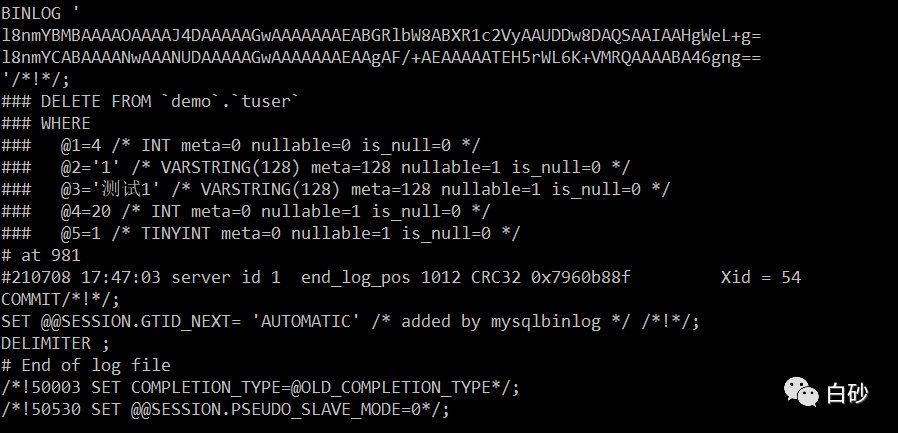 Row格式看到 Event_type 中记录了,一个是 Table_map event 操作表 ,一个是 Delete_rows event 行为。