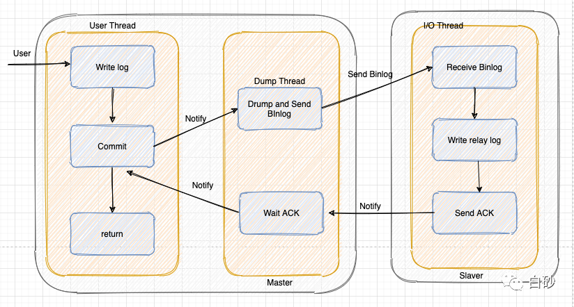 若 master 提交事务受到阻塞,出现等待超时,在一定时间内 master 没被告知已收到,此时 master 自动转换为异步复制机制。