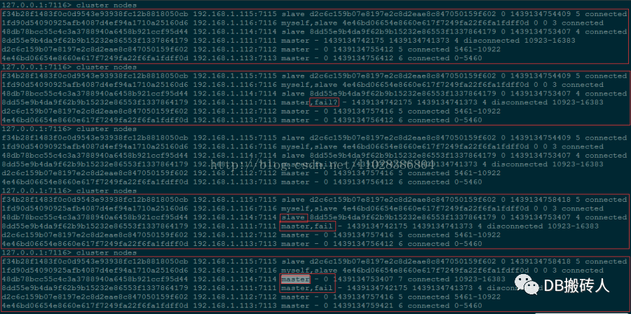 节点状态 fail 表示节点失败,对应的 slave 节点提升为 master