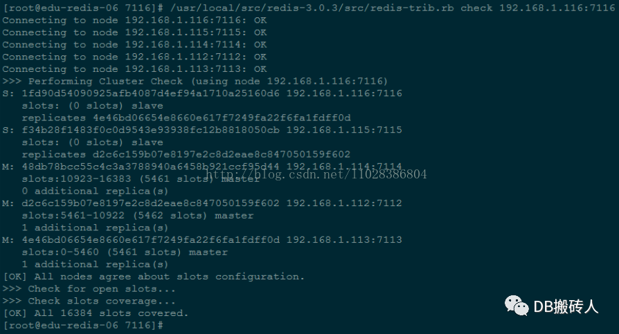 (5)再查看集群状态变化# /usr/local/src/redis-3.2.9/src/redis-trib.rb check 192.168.1.116:7116