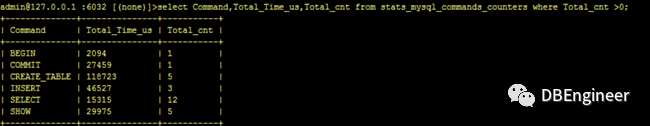 select Command,Total_Time_us,Total_cnt fromstats_mysql_commands_counters where Total_cnt >0;