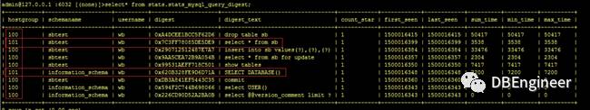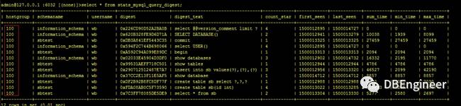 selecthostgroup,schemaname,username,substr(digest_text,120,-120),count_star fromstats_mysql_query_digest;