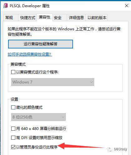 附:如果不想每次打开都使用管理员身份运行,可以右键单击plsql的属性,找到兼容性,勾选以管理员身份运行即可。