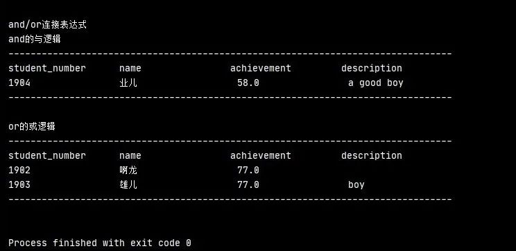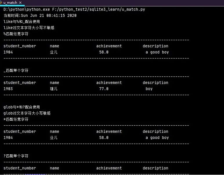 c.execute('select * from report_tb where description glob "a*" and achievement > 10')