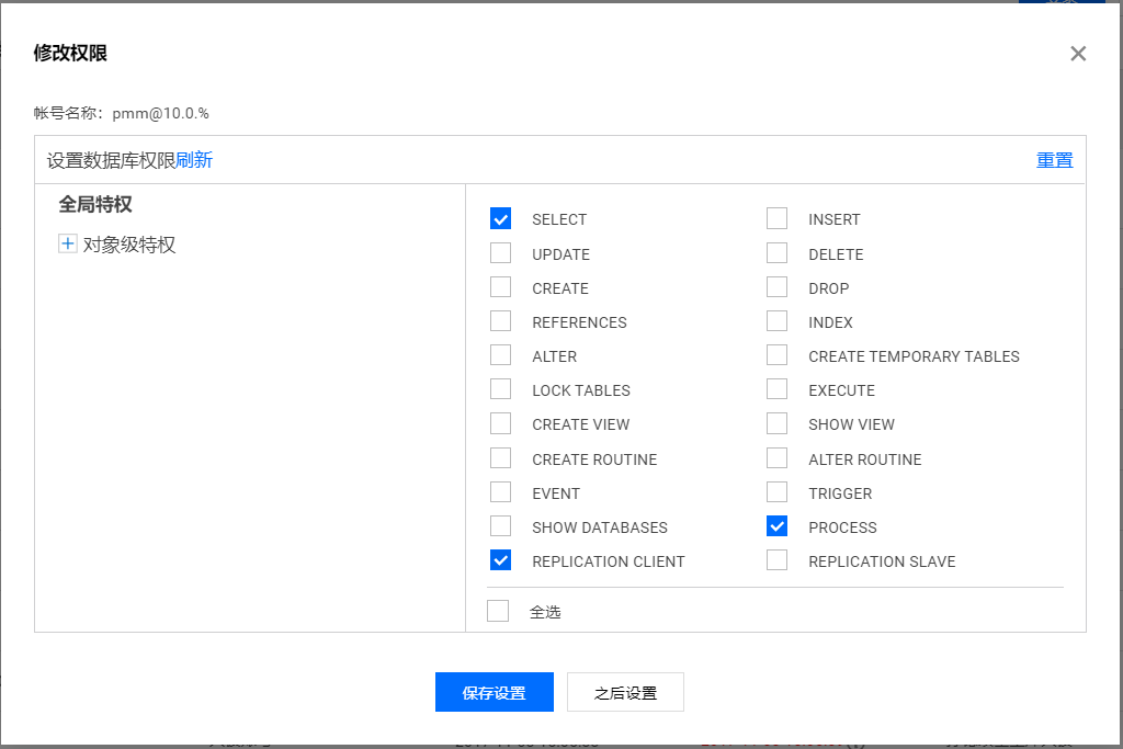 GRANT SELECT, PROCESS, REPLICATION CLIENT ON *.* TO 'pmm'@'%' IDENTIFIED BY '****' WITH MAX_USER_CONNECTIONS 10;