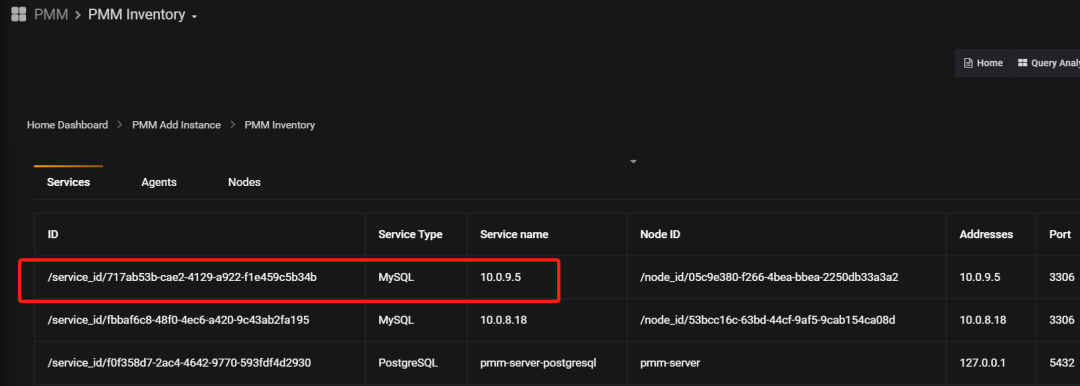 mysql:metrics No_rds_10.0.0.97 42002 YES pmm:***@tcp(10.0.0.97:3306)