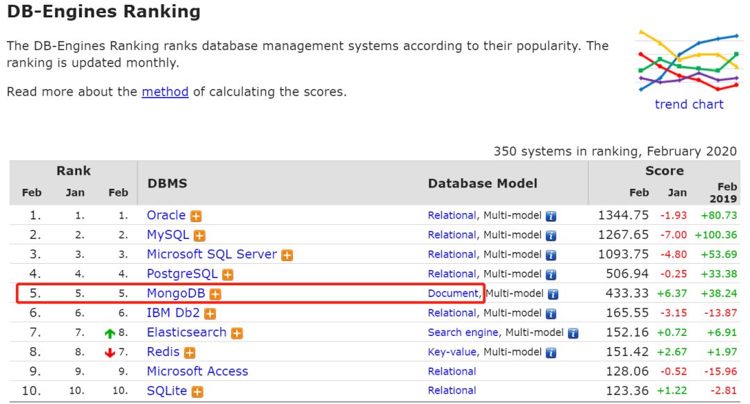 DB-Engines 数据库排行榜上一直稳坐前5,曾一度在2013、2014被评为年度数据库,是文档数据库中当之无愧的带头大哥。