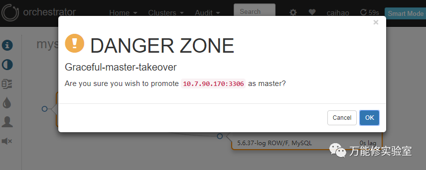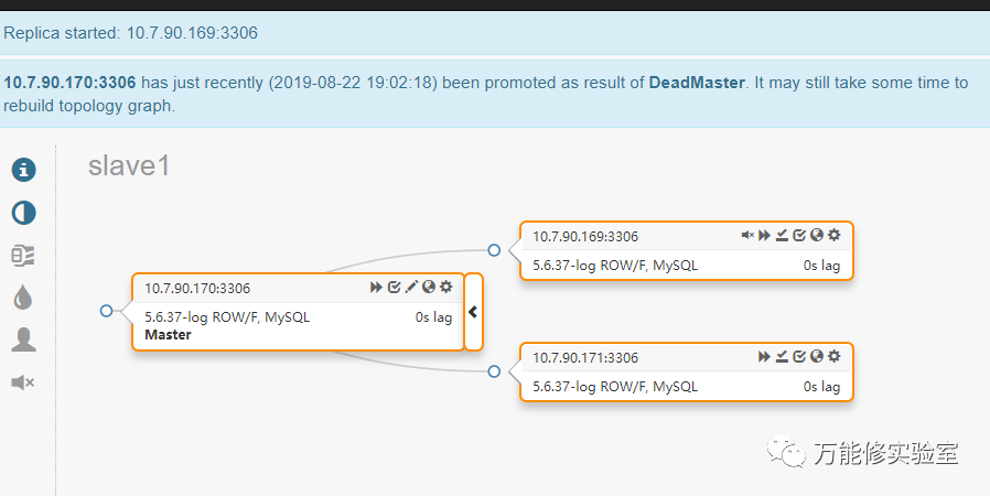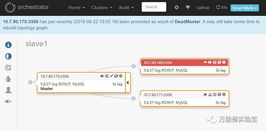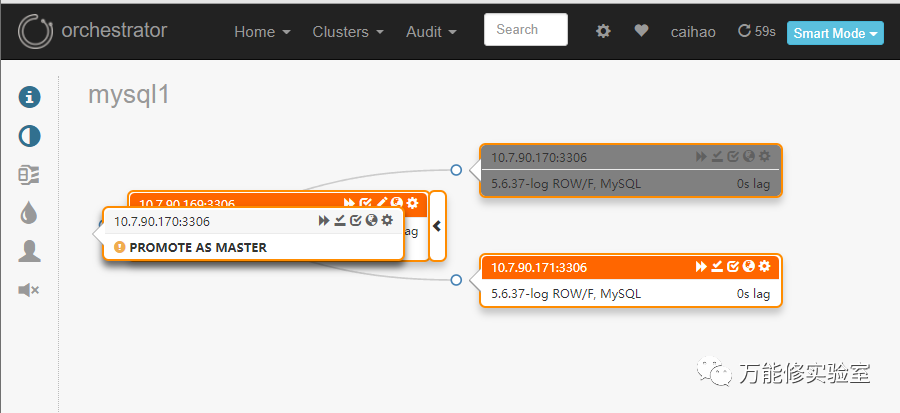只要Orch发现了复制关系中的一个节点,就会找到对应的master或者slave,识别出拓扑结构。这里尝试下把其中一个从库切换为主库。