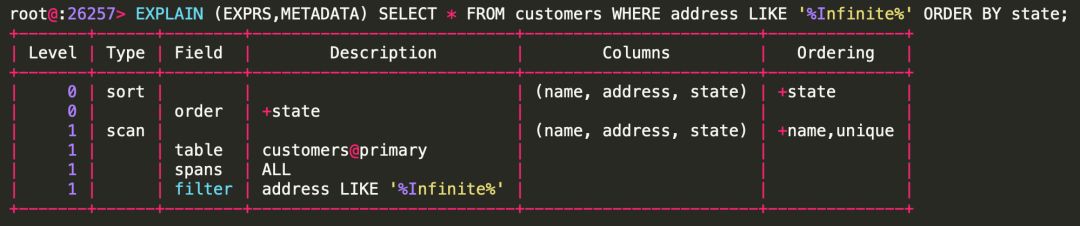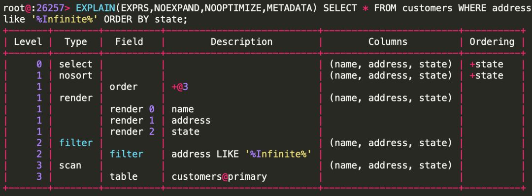 我们使用上文提到的 customers 表,进行一个SELECT查询,然后看看其中的一些planNode: