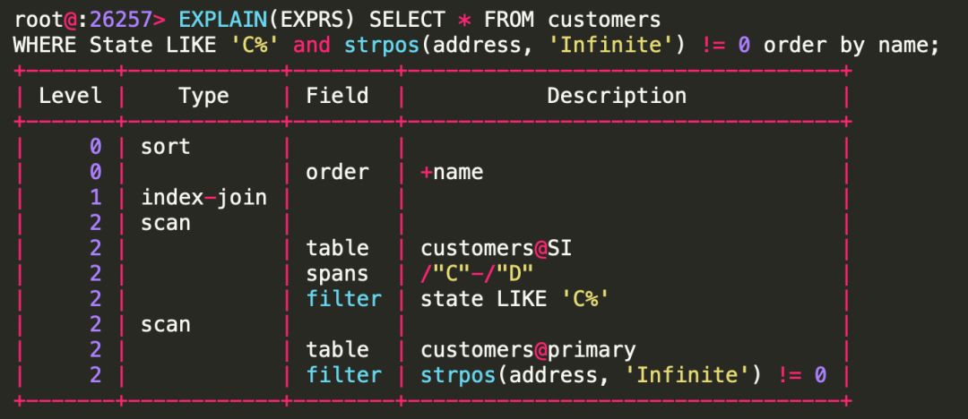 首先需要解释一下这个 indexJoinNode 是怎么来的,因为在这个SELECT语句的语法结构中并没有指明使用 SI 索引。实际上,这里还有一个我们之前没有提到的步骤:”plan expansion”(计划扩展),它会进行相关索引选择(关于目前是如何进行索引选择,可以参考此博客:https://www.cockroachlabs.com/blog/index-selection-cockroachdb-2/)。在这个例子中,SI 索引可以利用条件 “State LIKE ‘C%’” 来更高效得获取我们想要得数据。