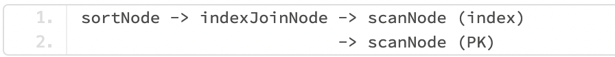 indexJoinNode 实现了索引的结果和表的行的连接。它一般在当一个查询可以使用索引时使用。它可能不包含查询所需的所有列,那些它不包含的列需要通过主键来获取。indexJoinNode 节点在两个scan节点的上面,其中一个scan扫描索引,另一个scan通过Primary Key进行点查。在这个例子中,我们可以看到 SI 索引用于获取符合 state 过滤条件的行,但是因为它没有包含 address 列,所以还是需要使用主键来获取。因为每个索引KV对都包含主键信息,我们可以使用该信息对PK进行点查。indexJoinNode.Next 从索引读取下一行,并为每一行添加PK读取需要的spans信息。