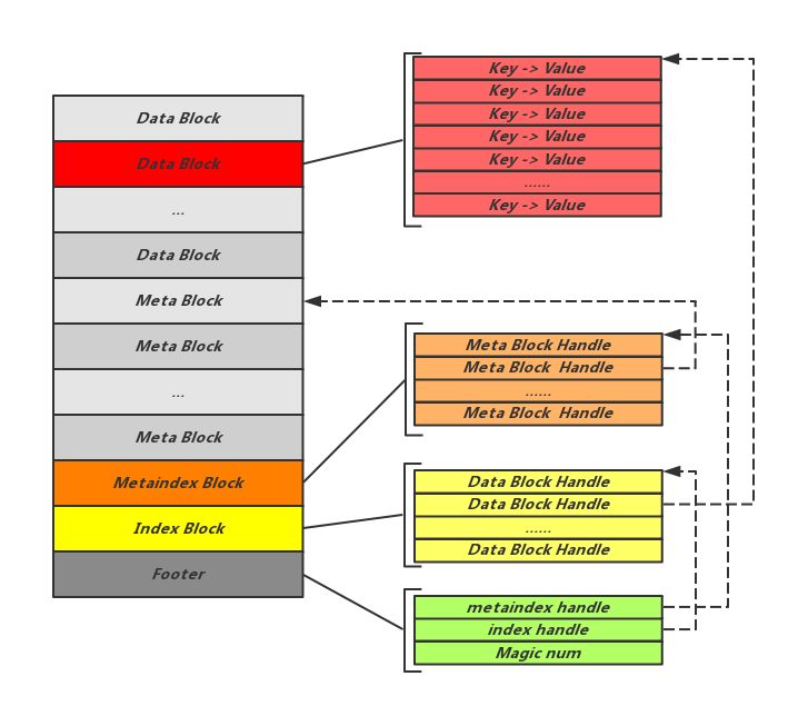 全称为 Sorted-String-Table,RocksDB 默认使用 BlockBasedTable 类型的 SSTable,对应由一系列存储块构成的物理文件。如下图,存储块根据数据内容可以分为数据块、BloomFilter 数据块、Table 属性块、范围删除块、索引块、元索引块等,额外的 Footer 结构是固定模式的、能够帮助解析文件结构的元信息。