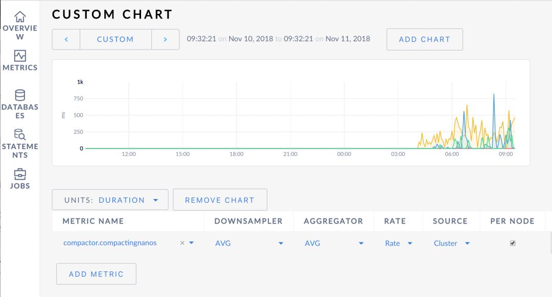 具体地,用户可以 Storage 仪表盘中查看读放大、SSTable 文件数量等监控信息(详见参考资料[9]),也可以在 Custom Chart 页中定制图表(详见参考资料[10]),指定一组监控指标,包括但不限于:
