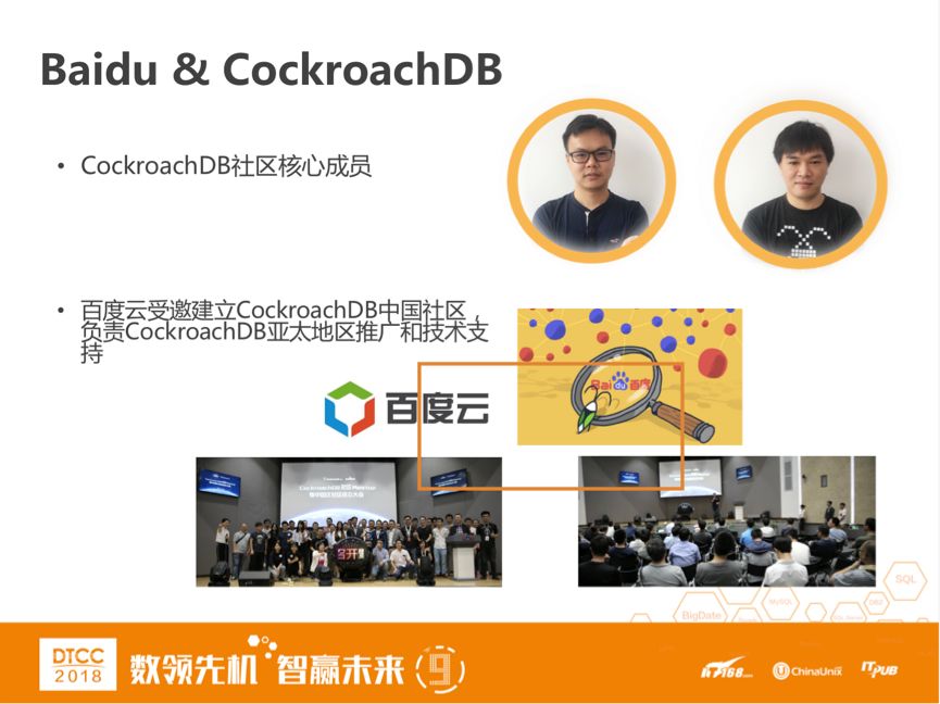 2018年5月10日,百度智能云DBA团队为中国数据库技术大会DTCC带来了NewSQL数据库CockroachDB在百度的最新进展。