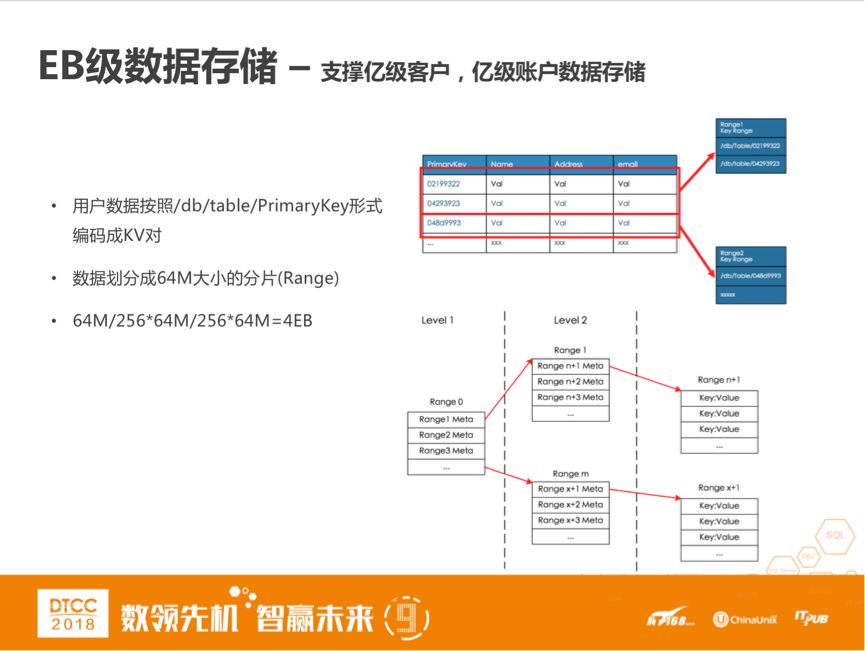 存储能力方面,CockroachDB支持EB级的数据存储,能够比较简单地解决亿级用户数据存储的问题。CockroachDB和传统关系型数据库一样,把用户数据以二维表的形式呈现给用户,但CockroachDB底层会把这种二维表编码成KV的形式存储起来。按照Key范围划分成64M大小的一个个数据分片,CockroachDB称之为Range。同时,CockroachDB使用二级路由的方式管理Range,顶层路由有且只有一个Range,顶层路由记录二级路由信息的位置和Key范围,二级路由记录真实的每个Range的位置和Key范围。其中每条路由信息的大小为256个字节,通过这个公式可以得出,CockroachDB最大可支持4EB用户数据管理。