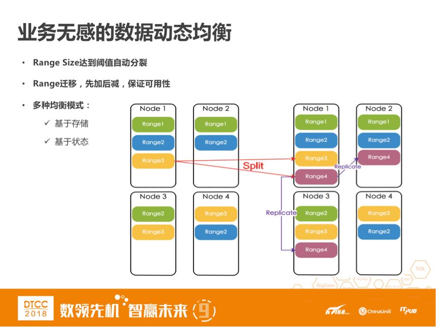 集群的数据会随着用户的增删改操作不断发生变化,如果集群不支持动态调整,那么负载会逐渐向部分节点倾斜,导致集群负载不均。CockroachDB目前支持两种模式动态调整集群负载,一种是基于存储,把数据存储平均到所有节点,保证所有节点的数据量基本保持一致。另一种是基于状态的均衡模式。系统根据range的负载和数据量决定是否要做分裂,把节点负载也作为数据均衡的考虑因子,来决定是否需要把range迁移到其他节点,分摊负载,整个调整过程对用户无感知。