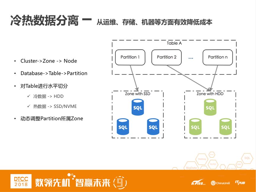 CockroachDB把集群的组织结构划分成三层,Cluster、Zone、Node。 Cluster和Node比较好理解,Cluster是集群的意思,Node对应到集群中的CockroachDB实例。Zone这个概念是CockroachDB引入的一个独有概念,和Google spanner的Directory比较类似,一个Zone由多个具有相同属性的Node组成。在这里我们根据存储类型把集群的节点分成两组Zone,一组是使用SSD或者NVME高速硬盘节点,一组是使用SATA磁盘的低速硬盘节点。通过对用户的库、表进行Zone存储设置,已有数据按照规则逐步迁移到指定的Zone中,新写入的数据直接按照规则写入指定Zone中。通过Zone Configuration这个特性达到了对冷热数据进行分离,降低存储成本的功能,当然Zone Configuration特性还可用于跨地域部署时实现用户数据就近访问的功能。