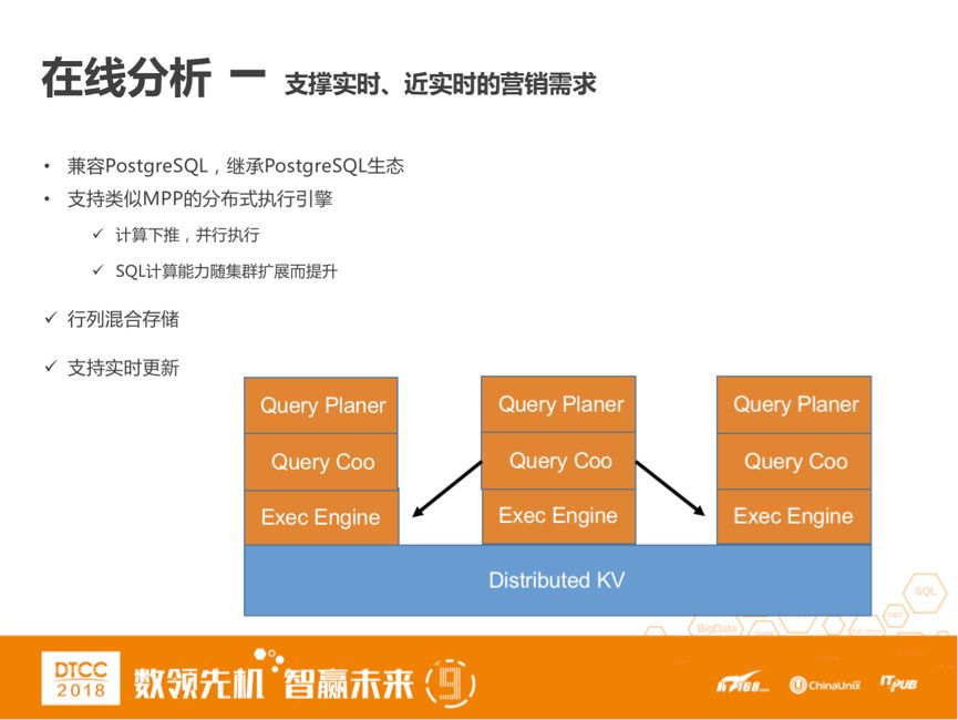 首先,CockroachDB选择兼容PostgreSQL协议和语法,能够很好地继承PostgreSQL的生态,能无缝地对接PostgreSQL相关的第三方组件。其次,CockroachDB实现了类似MPP数据库的分布式执行引擎,把复杂查询的计算下推到各个节点,让计算并行执行,从而使SQL的计算能力可以随着集群的扩展而得到提升。