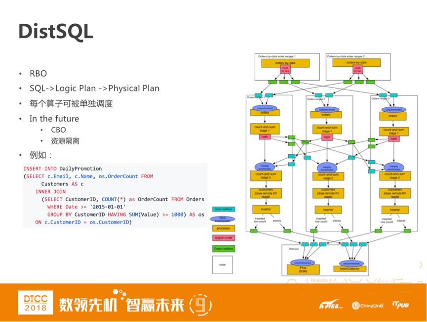 CockroachDB的分布式执行引擎目前实现的是Rule Base的优化器,SQL解析之后生成一个类似单机Plan Tree的Logic Plan,由优化器重写之后,进一步结合数据分布的特点生成一个可执行的分布式执行计划Physical Plan。CockroachDB每一个算子都由单独的goroutine单独调度,通过Mailbox机制协同。因为每一个算子相对比较独立,后续实现SQL挂起和资源隔离也相对比较容易。