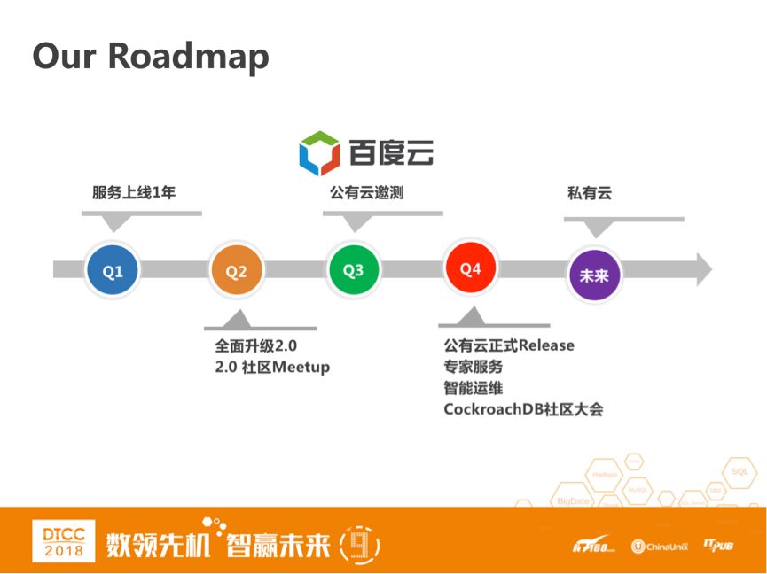 百度智能云会全面升级CockroachDB到2.0版本,Q3会在公有云开启邀测,年底会正式上线到公有云,提供更专业的服务。