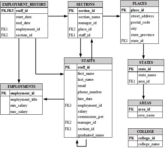 数据库中包含8个表,分别为:雇员(staffs)、部门(sections)、地点(places)、国家(states)、地区(areas)、岗位(employments)、工作履历(employment_history)和院校(college)。表之间的关系,请参见图1 hr实体关系图。