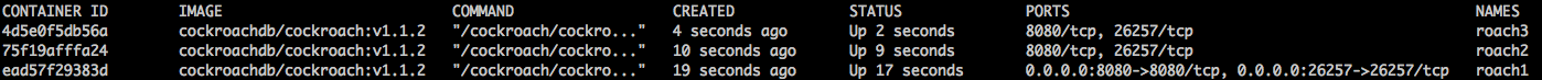 docker run -d \--name=roach2 \--hostname=roach2 \--net=roachnet \-v "${PWD}/cockroach-data/roach2:/cockroach/cockroach-data" \cockroachdb/cockroach:v1.1.2 start --insecure --join=roach1docker run -d \--name=roach3 \--hostname=roach3 \--net=roachnet \-v "${PWD}/cockroach-data/roach3:/cockroach/cockroach-data" \cockroachdb/cockroach:v1.1.2 start --insecure --join=roach1