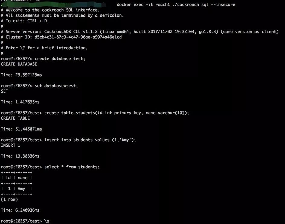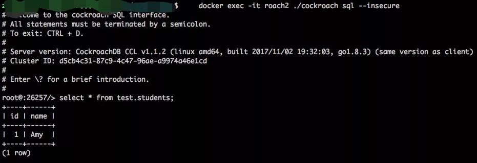 首先,在其中一个节点容器中启动Cockoroach sql shell,并写入数据。