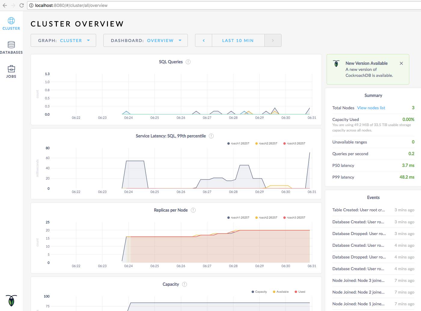 启动容器时,容器里8080端口被映射到本机8080端口。所以通过http://localhost:8080即可访问CockroachDB集群Admin UI进行监控。